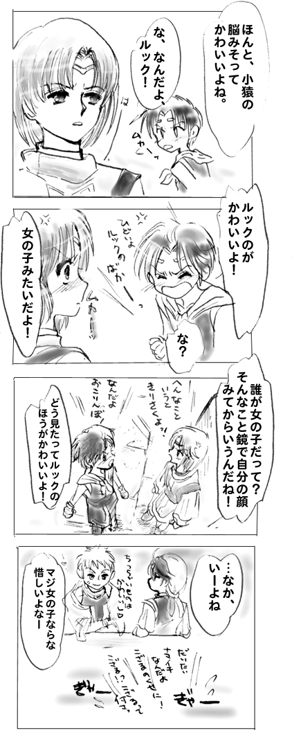 ルックさんはとっても口が悪く、2主はすぐ拗ねるのでよく喧嘩になるらしいです。でも仲良しさんです。 なので、坊ちゃんはとっても面白くないらしい(笑)。実はひそかにうちの幻水での一番の萌えシチュエーション、初お披露目ですv ちなみに4コマめはシーナ。 続きもちょこっとあります。興味ある方はこちら。(ただし、坊ちゃんがちょっと青少年というかオタクくさいというか…)